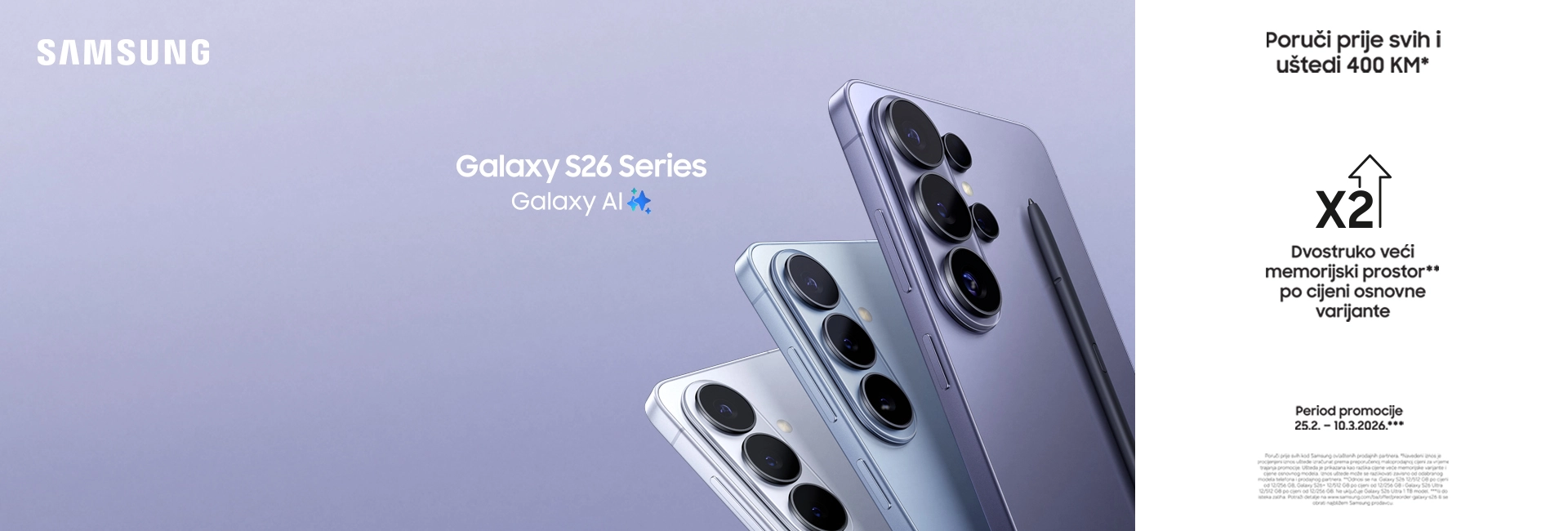 U periodu od 25.02. do 10.03.2026. godine, uz kupovinu bilo kojeg modela iz Galaxy S26 serije, dobijate uređaj sa X2 memorijom bez dodatne doplate. Više prostora za fotografije, videozapise, aplikacije i sve ono što vam je važno – bez kompromisa i bez dodatnih troškova.